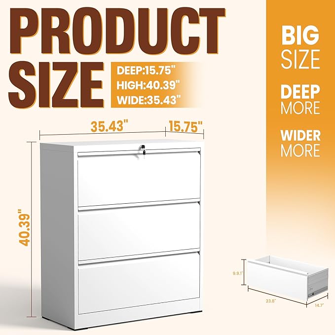 3-Drawer Lateral File Cabinet with Lock, Black Metal Filing Cabinet for Office or Home – Secure Storage for Letter/Legal/A4/F4 Documents, Easy to Assemble Locking File Organizer (White, 3 Drawer-40"H)
