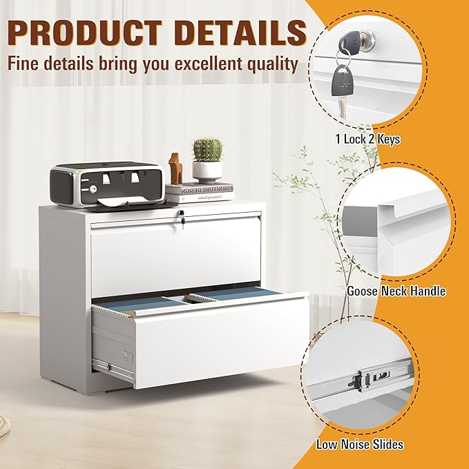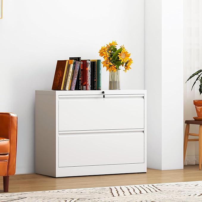 2-Drawer Lateral File Cabinet with Lock, Black Metal Filing Cabinet for Office or Home – Secure Storage for Letter/Legal/A4/F4 Documents, Easy to Assemble Locking File Organizer (White, 2 Drawer-28"H)