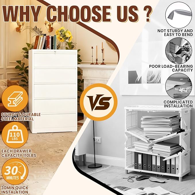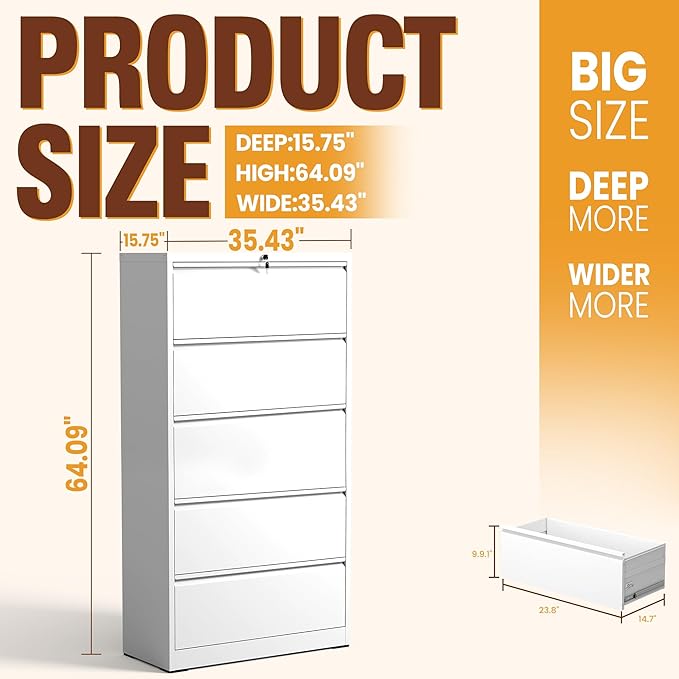 5-Drawer Lateral File Cabinet with Lock, Black Metal Filing Cabinet for Office or Home – Secure Storage for Letter/Legal/A4/F4 Documents, Easy to Assemble Locking File Organizer (White, 5 Drawer-64"H)