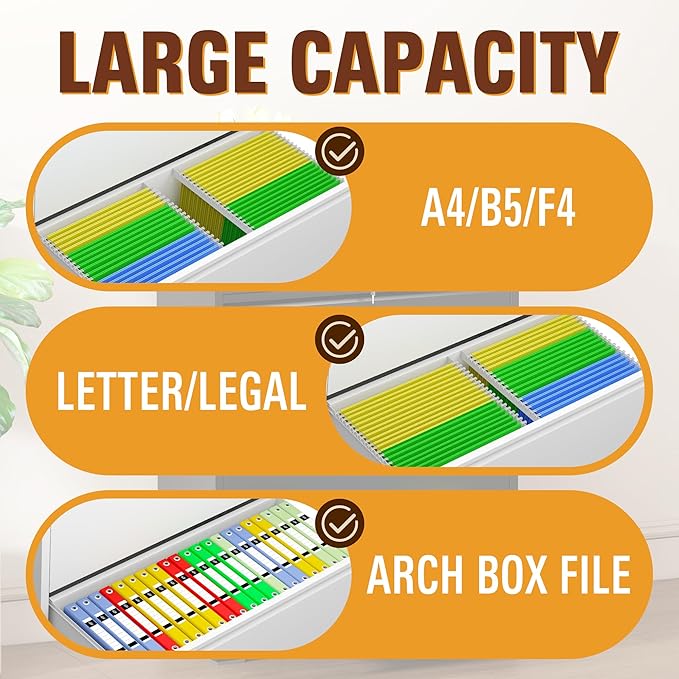 - 【Optimized Storage Capacity】 Designed with spacious deep drawers and adjustable hanging rails, this filing cabinet organizes Letter, Legal and A4/F4 documents with ease. This smart storage solution maximizes vertical space while keeping documents neatly categorized for easy access and workflow efficiency.