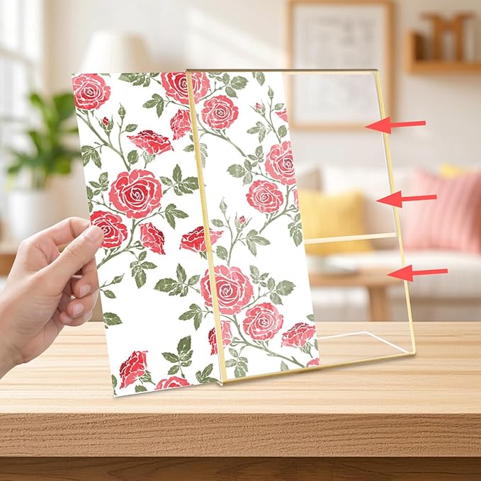 - 【Stable & Convenient】The acrylic display stands features an acrylic frame and a gold base, with the frame fitting directly into the triangular base. Each side of the sign holder has an opening for easy insertion of paper. The triangular base provides excellent support, ensuring the clear frame will not tip over and can stand securely.