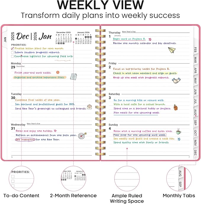 - Thoughtful Weekly Layout: Our planner features each two-page weekly spread, from Monday to Sunday, offering ample lined writing space. It also includes popular holidays, two-month reference previews, and a dedicated priorities area, making it easy to manage appointments, notes, and daily tasks.