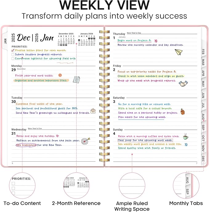 - Thoughtful Weekly Layout: Our planner features each two-page weekly spread, from Monday to Sunday, offering ample lined writing space. It also includes popular holidays, two-month reference previews, and a dedicated priorities area, making it easy to manage appointments, notes, and daily tasks.