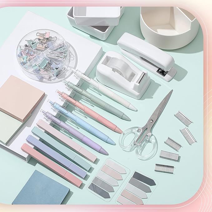 - All Inclusive Package: included in this pack is 1 pen holder, 2 melamine dishes, 1 Stapler, 1 box of staples, 1 Tape holder, 1 tape, 1 clip organizer box, 1 Scissors, 5 neutral pens, 2 packs of index stickers, 3 sticky notes and 4 fluorescent pens