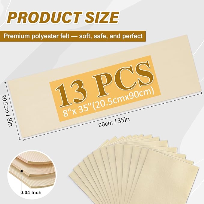 - 【Felt Fabric Set】: Our khaki felt fabric set includes 13 rolls total, each measuring 20.5 x 90 cm (8" x 35") with a 1.4mm thickness