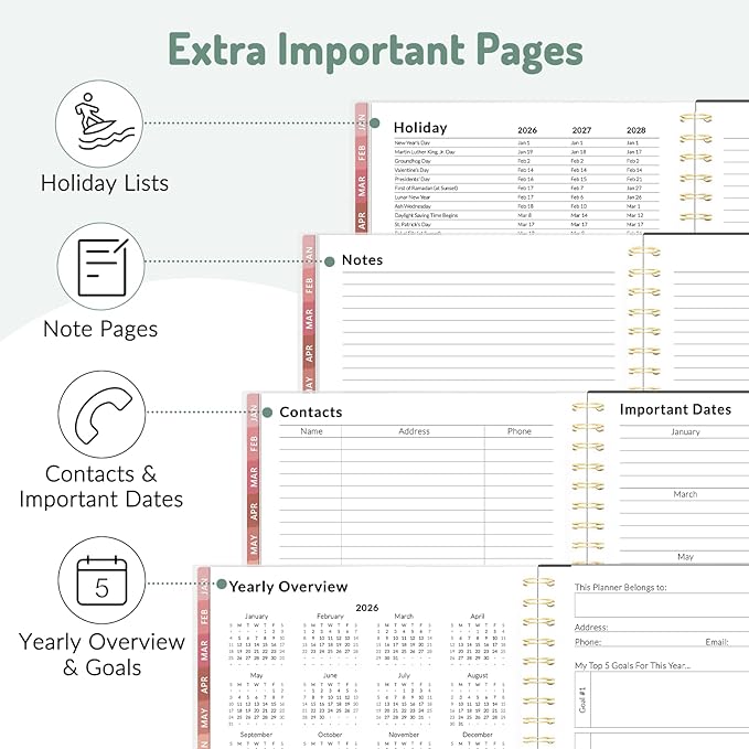 - Additional Planner Features: Starting with a yearly goals page for goal setting, also featuring reference calendars, a contact page, an important dates page, and holiday lists to keep on top of your special dates. Bonus extra notes pages for capturing everything from little to-dos to big dreams