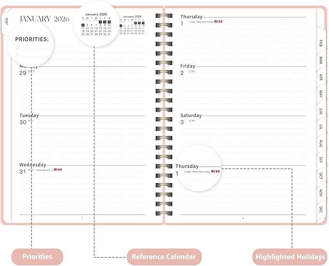 - [THOUGHTFUL DESIGN] – The agenda 2026 comes with an elastic band to keep it securely closed, monthly tabs for quick navigation, and a clear double-sided pocket for extra storage. Each monthly calendar page includes a motivational quote to inspire and keep you focused.