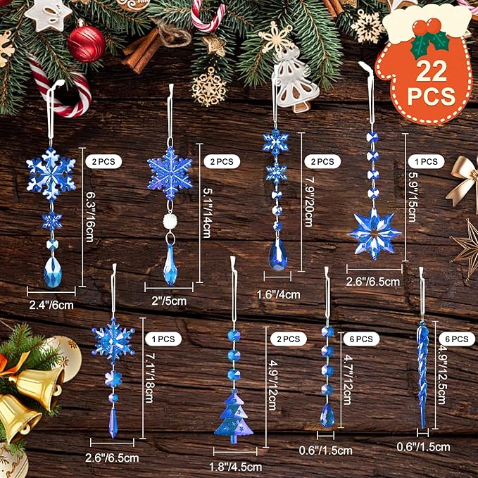 - Christmas Crystal Ornaments: You will receive 22pcs crystal Christmas ornaments with 8 styles, including 6pcs icicles; 5 snowflake style crystal pendants, 8 pieces in total; 2pcs crystal Christmas tree decorations; 6pcs water drop crystal decorations, which is a great addition to your Christmas party decorations