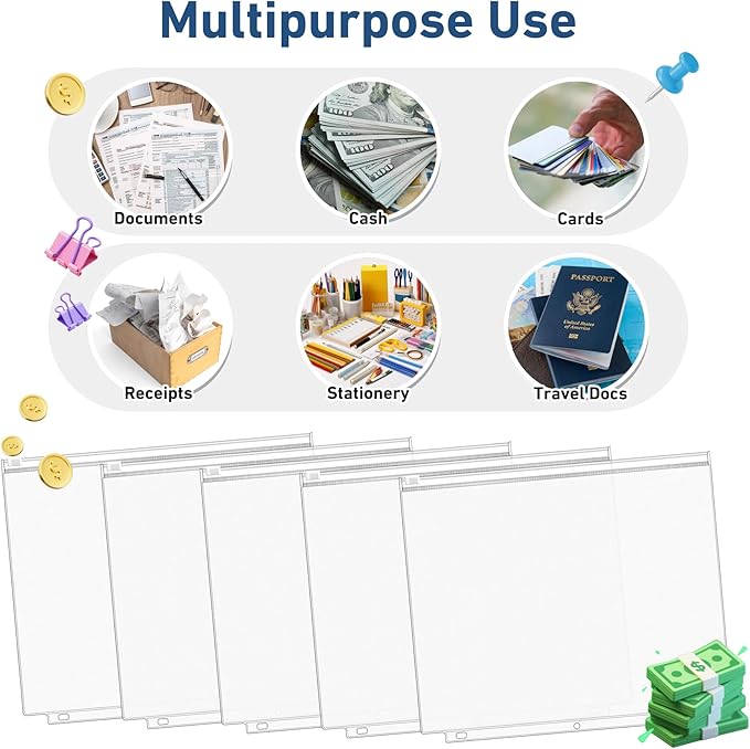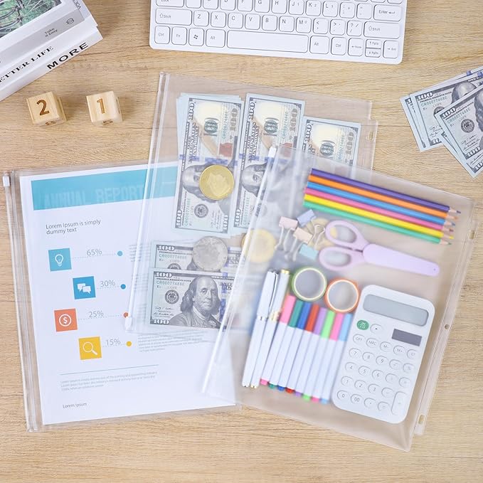 - Perfect Fit for Letter-Size Documents: Designed for 8.5 x 11 inch paper, these 11.4 x 9.8 inch binder pouches are 3-hole-punched for standard 3-ring binders. Translucent allows quick content visibility, ideal for organizing cash, bills, coupons, invoices, or ID cards