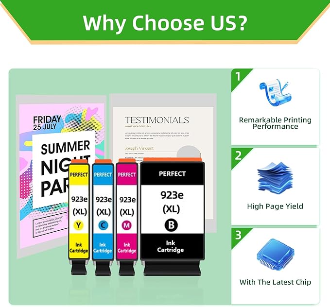 - Package Content: 923XL 923e Ink Cartridges Combo Pack (1 × 923e Black, 1 × 923e Cyan, 1 × 923e Magenta, 1 × 923e Yellow Ink Cartridge)