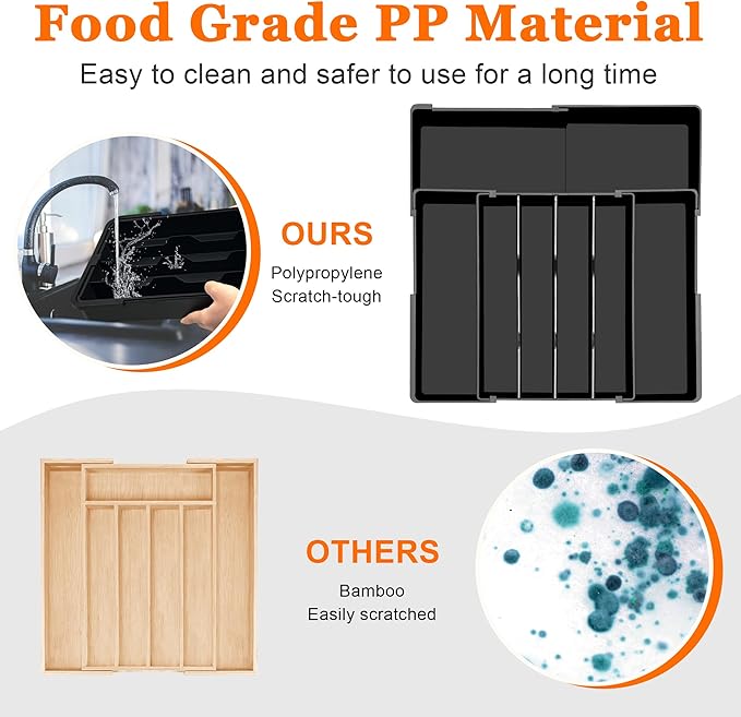 - 【Premium Food Grade Material for Safety】: Crafted from thick, sturdy food-grade PP material, our utensil drawer organizer is built to last. It’s also BPA-free, ensuring that your kitchen utensils stay safe for your family’s health. Cleaning is a breeze—simply rinse with water or wipe with a cloth. Just avoid the dishwasher to keep your flatware organizer for drawer in top condition!
