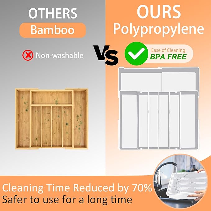 - 【Premium Food Grade Material for Safety】: Crafted from thick, sturdy food-grade PP material, our utensil drawer organizer is built to last. It’s also BPA-free, ensuring that your kitchen utensils stay safe for your family’s health. Cleaning is a breeze—simply rinse with water or wipe with a cloth. Just avoid the dishwasher to keep your flatware organizer for drawer in top condition!