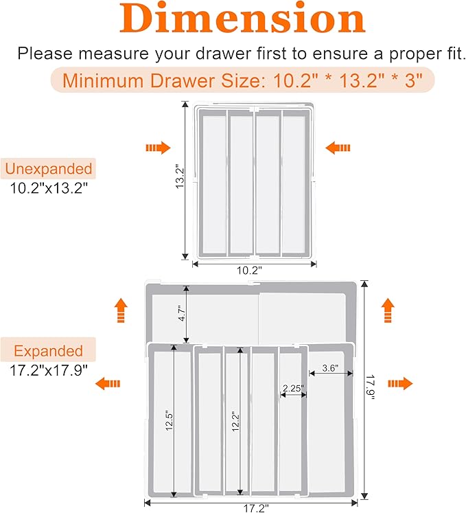 - 【Perfectly Adaptable to Your Drawer Size】: This large silverware drawer organizer is designed with flexibility in mind, adjusting to fit various drawer sizes from 10.2" to 17.2". When fully expanded, it measures 17.2" × 17.9" × 3", and when folded, it shrinks down to 10.2" × 13.2" × 3". With a height ranging from 2.4" (inside) to 2.55"/2.8" (outside), our expandable utensil drawer organizer is perfect for optimizing your space. It features ultra-thin edges that minimize wasted space, allowing you to make the most of every inch of your drawer. Just remember to measure your drawer dimensions before ordering for a snug fit!