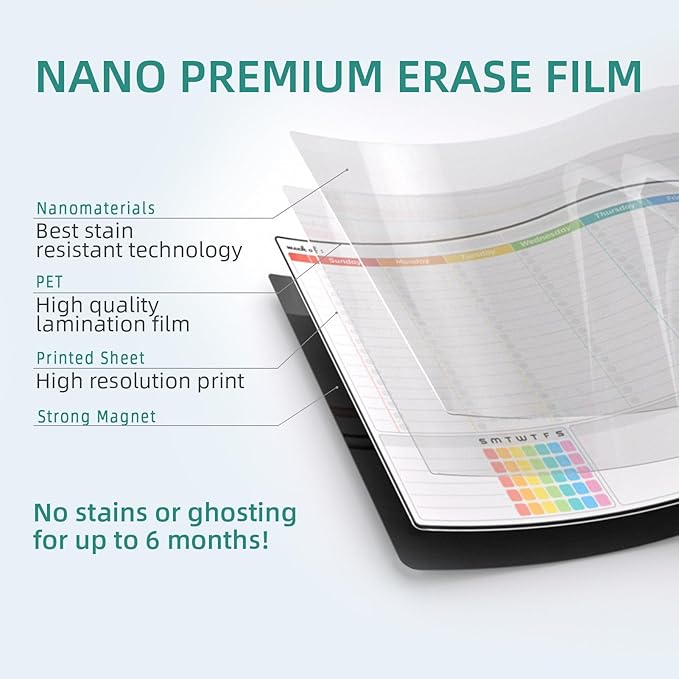 - Erases easily - Our calendars use premium nano erase film, making it incredibly easy to wipe off notes, even those that have been written for a long time. No residue, no fuss.