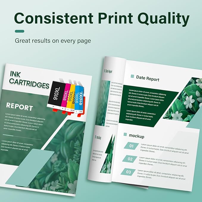 - High Page Yield: It yields up to 1,200 pages for each 910XL Black ink,1000 pages for each 910XL color ink,at 5% coverage (A4/letter)