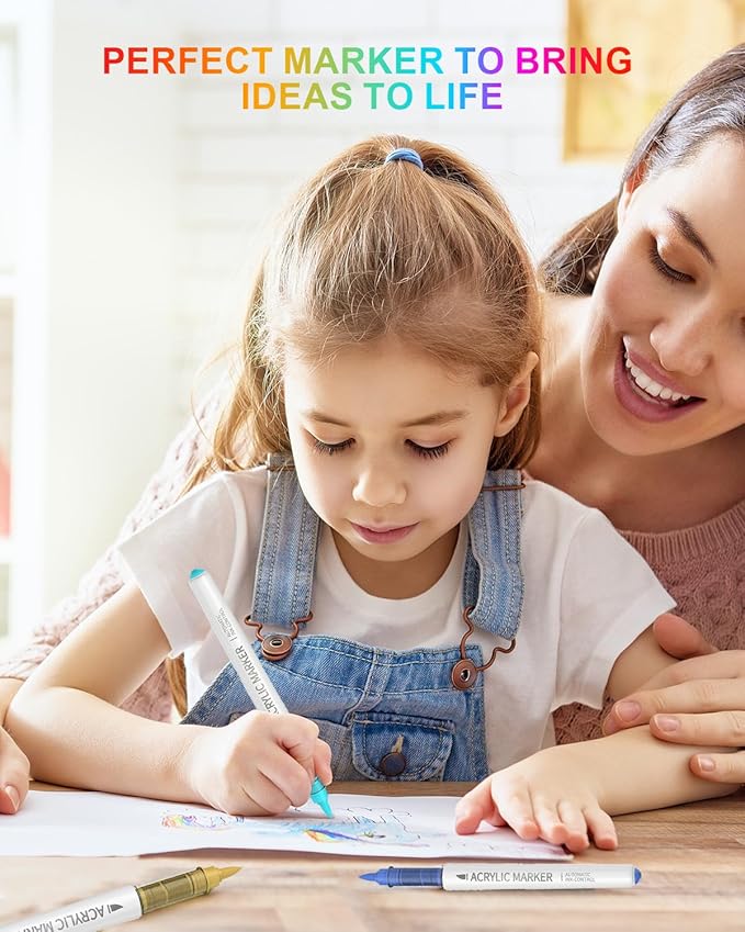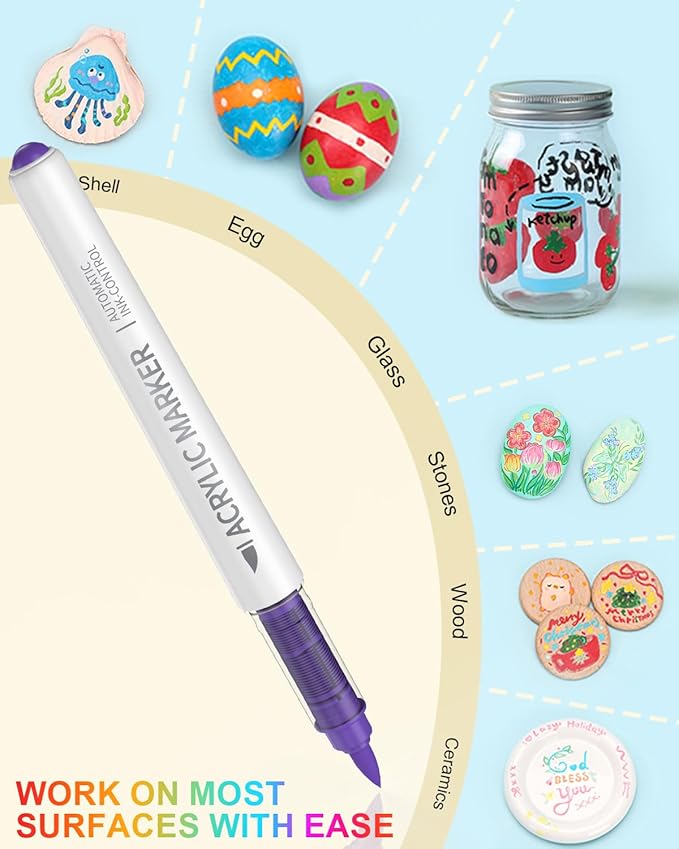 - Works on Most Surfaces: Create without limits. These acrylic paint markers work beautifully on paper, canvas, rocks, wood, fabric, ceramic, glass, and more. Whether you're journaling, customizing shoes, decorating mugs, or painting canvas boards, your creativity follows wherever the inspiration goes.