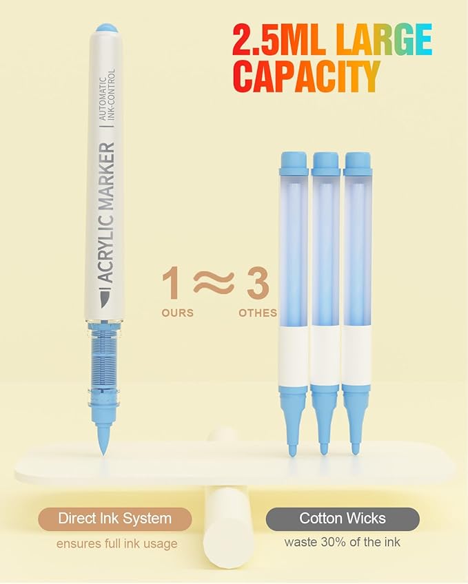 - Works on Most Surfaces: Create without limits. These acrylic paint markers work beautifully on paper, canvas, rocks, wood, fabric, ceramic, glass, and more. Whether you're journaling, customizing shoes, decorating mugs, or painting canvas boards, your creativity follows wherever the inspiration goes.