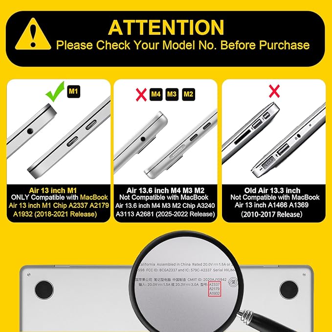 - This case is specifically designed for 2021 2020 2019 2018 MacBook Air 13 inch with Touch ID and Liquid Retina Display (Models: M1 A2337 A2179 A1932). Note:【This case is NOT compatible with other model laptops. Please kindly check the model number "Axxxx" on the back of the laptop before purchase, make sure you choose the exact same model number as the listing title stated "A2337" or "A2179" or "A1932"】.