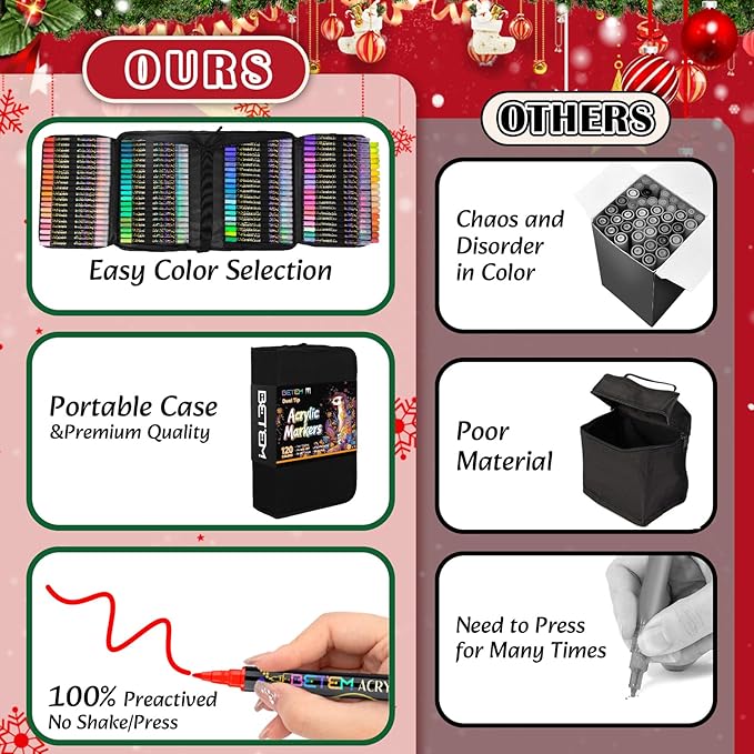- 【120 Vibrant Colors & PORTABLE CASE】120 colors altogether, including 12 metallic colors for you to choose from. Rich color range means more mixability and fun. Betem acrylic paint markers is a perfect choice to design your scrapbook, bullet journal, planner, Christmas card, birthday gifts, greeting card, or any DIY crafts projects. These art markers are well packed in a sturdy and durable zipper bag for better storage and organization, color selection