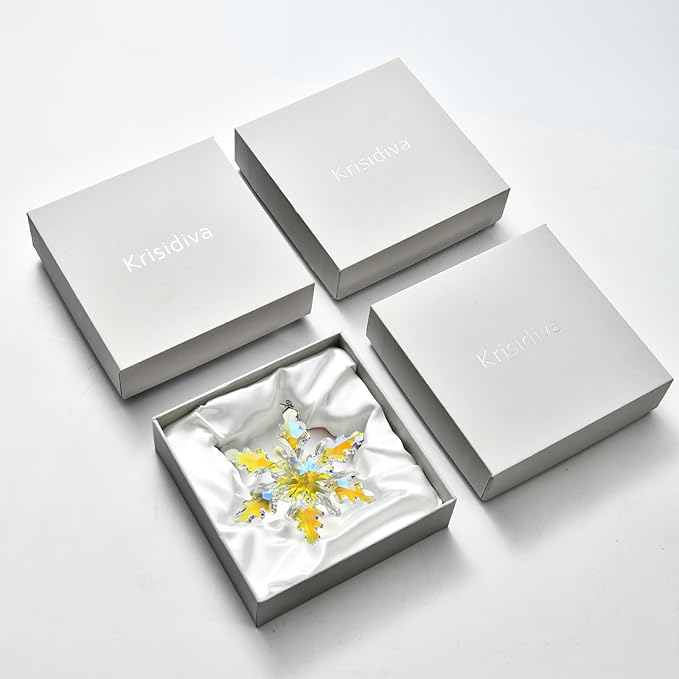 - The product includes: (1) Krisidiva 2025 snowflake jewelry, 2025 version, silver/transparent/color crystal, engraved with labels, gifts for four seasons, size: 4.41 * 3.54 inches, box with Krisidiva logo, ribbon (2), crystal chain (1)