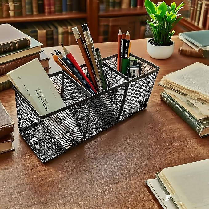 - ★[ Smart size ] This new pencil holder is made perfect with the size L10.43 x W3.3 x H4 inch . It has 3 compartments . The storage basket organizer is deep allowing it to hold more contents . Simple design . You can find anything that you want to see at a lance .
