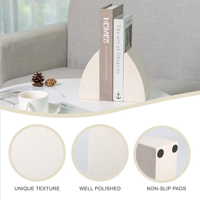 Koville Marble Bookends for Shelves, Large Bookends for Heavy Books, Natural Stone Book Stopper for Books CD Movies, Aesthetic Decorative Book Ends (Sail-Beige)