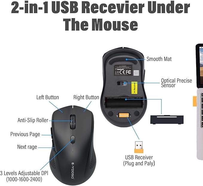 - 3-level DPI Optical Mouse: The mouse is optically designed for precise control even on smooth surfaces.3-level switchable DPI (1000/1600/2400) allows you to choose your favorite moving speed of cursor by adjusting the DPI button.In addition,this wireless mouse is ergonomic design,features an ambidextrous shape and soft rubber side grips that fit comfortably in your palm,also has sweat-proof anti-fingerprintand and skin-friendly finish,providing you with the most comfortable grip.