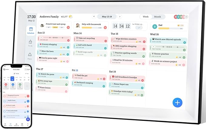- [Digital Calendar Chore Chart & Meal Planning] Transform household responsibilities with our E-Chore Chart and Task Reward System that makes chores fun for kids. The integrated meal planner automatically generates grocery lists and weekly menus, answering the eternal "What's for dinner?" question. Color-code each family member's tasks for instant visual organization.