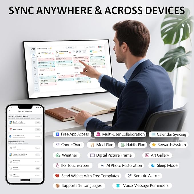 - [Effortless Setup & Smart Family Calendar Planner] Get organized in minutes with our plug-and-play system - just connect to WiFi and watch your calendars sync automatically. The free companion app lets you manage schedules from anywhere, while the multi-collaboration feature allows every family member to update events in real-time. Perfect for busy parents, students, and working professionals who need seamless coordination.