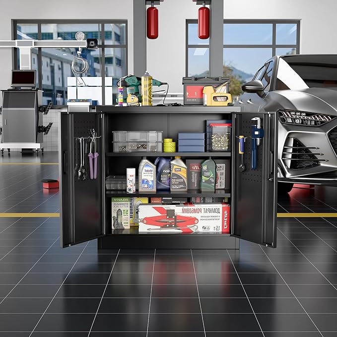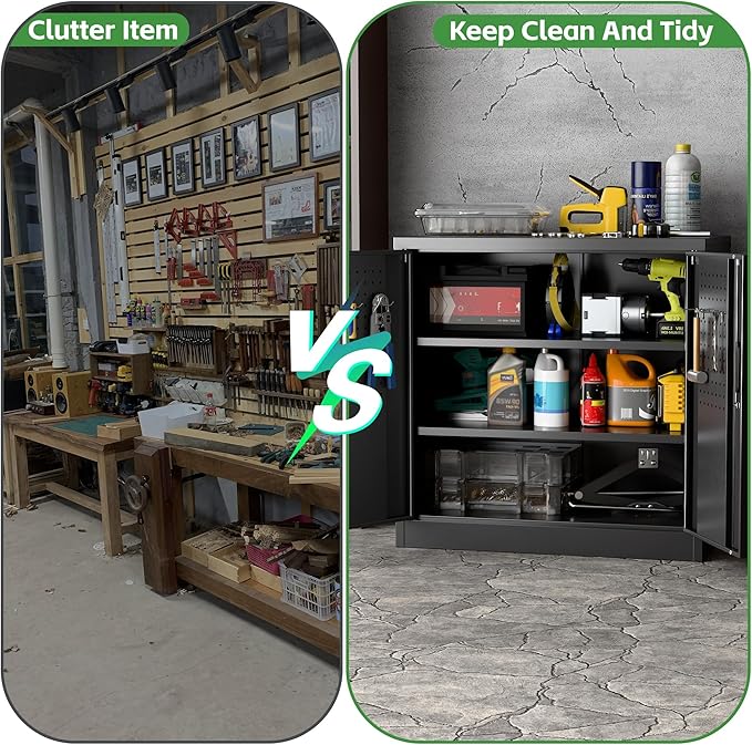 - Redesigned for Efficiency: Integrated Pegboard Doors + Free Hooks! "NEW UPGRADE: Double doors feature full pegboard panels and include four heavy-duty hooks. Instantly hang tools, cords, or accessories – maximizing every inch of space for a super-organized, ultra-convenient workspace."