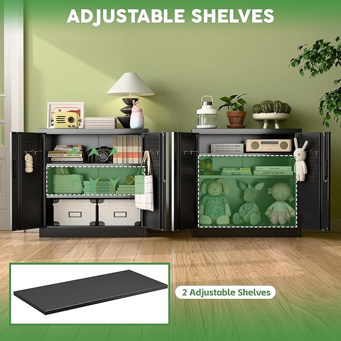- [Adjustable Shelves] Metal garage storage cabinet has 2 adjustable and removable shelves, which can offer you flexible space. Each shelf of the storage cabinet can hold up to 120lbs.