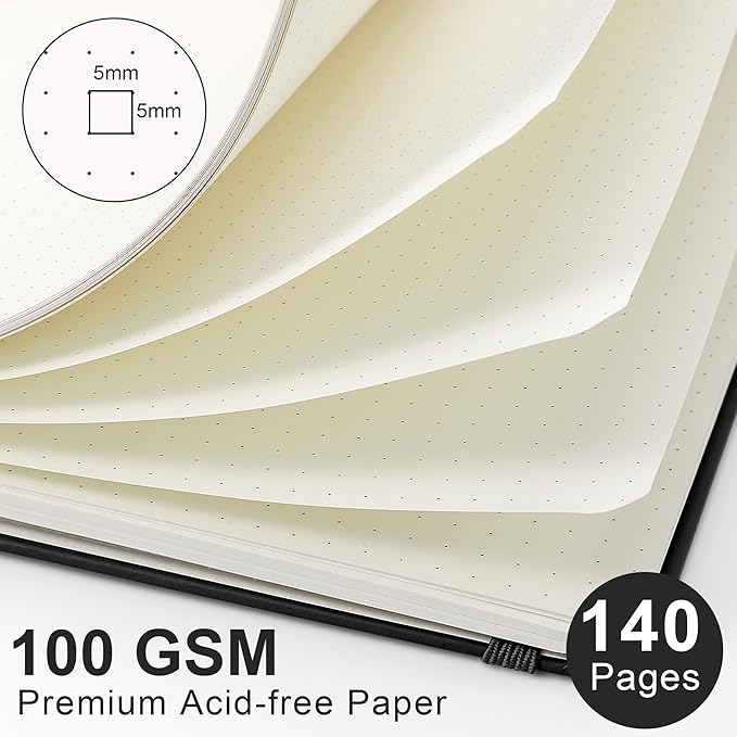 - PREMIUM PAPER: Crafted with time-resistant 100 GSM paper, this dotted journal preserves thoughts flawlessly while resisting ghosting/bleed-through with most pens. Acid-free material ensures long-term preservation, and its smooth surface enhances writing clarity - blending durability and premium performance