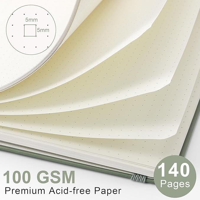 - PREMIUM PAPER: Crafted with time-resistant 100 GSM paper, this dotted journal preserves thoughts flawlessly while resisting ghosting/bleed-through with most pens. Acid-free material ensures long-term preservation, and its smooth surface enhances writing clarity - blending durability and premium performance
