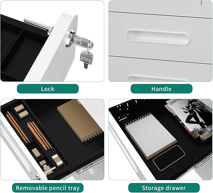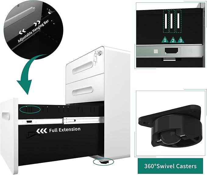 - Convenient & Free-range Mobility: Rolling file cabinet (no need to install except casters) with rounded corners and inset handles, You only need to install 4 x 360° swivel casters. Easy and safe to move. Warm tip: If the items placed are too heavy, it is recommended to reduce the weight of the items before moving them