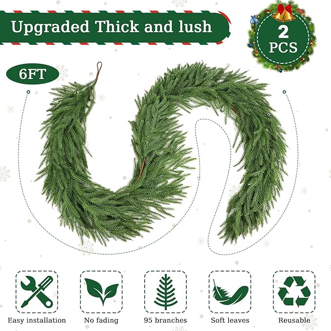 - 【Realistic Norfolk Pine Garland】Upgraded thick and lush 95 pine branches, each pine garland has a realistic, soft-touch feel that genuinely looks like fresh pine. 6ft pine garland are the perfect length for decorating mantle and dining table, added an elegant, festive touch to holiday decor.lush, realistic, and have a great fullness.