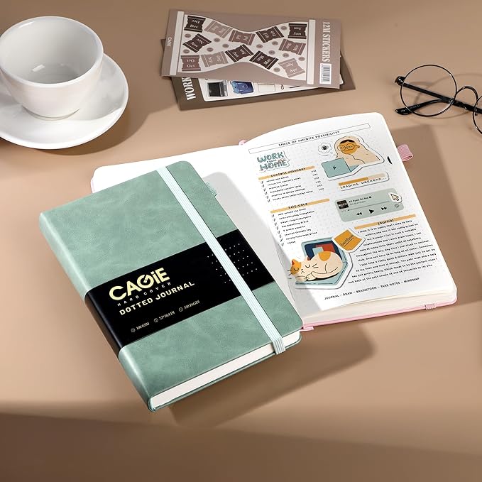 CAGIE Bullet Dotted Journal Notebook 320 Pages 100 GSM Paper Hardcover B5 Dot Grid Notebook Leather Journals for Writing Women Men Work Journaling, Green