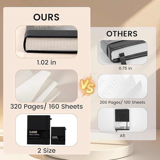 - GRAPH PAPER NOTEBOOK: A5 graphing notebook (5.7'' x 8.3'') features 320 pages with a durable vegan leather hardcover. Inside, 5mm × 5mm graph paper are complemented by a storage pocket, ribbon bookmark, and elastic closure band