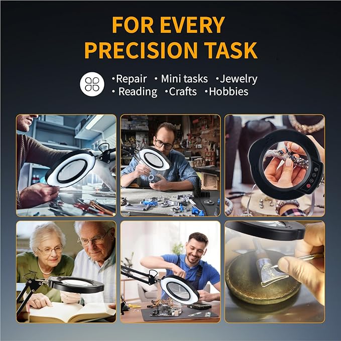 - Eye-Friendly Lighting: Lighted Magnifying Glass Features 10 brightness levels and 5 color temperatures for flexible lighting adjustment based on usage scenarios. Glare-free LED illumination gently brightens the work area, reducing eye strain. Memory function automatically retains the last setting; returns to default white light after unplugging. Ideal for Ideal for repairers, soldering, artists, architects, sculptors, and more.