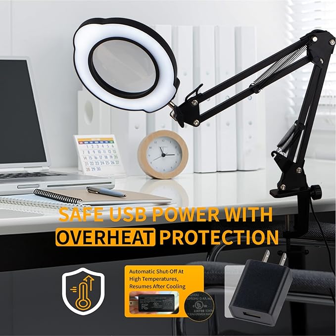 - UL Certified Safe Plug: Unlike standard plugs, our plugs feature UL certification and incorporate built-in overheat protection. They automatically cut off power during abnormal temperature conditions and resume operation after cooling down. Enjoy complete peace of mind throughout your use of this Magnifying Glass with Light and Clamp.