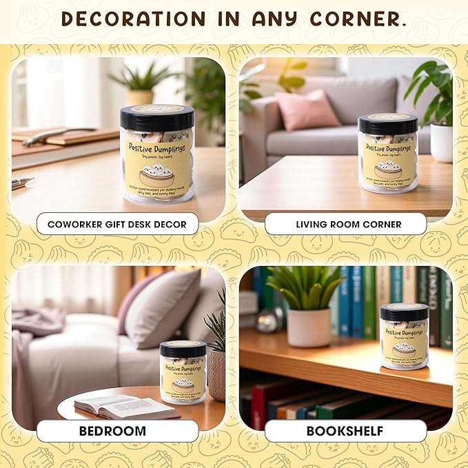 - ๐ฎ Affirmations with a Crunchy Twist โ This Positive Dumplings Jar features 60 Dumpling-shaped cards packed with uplifting quotes, clever wordplay, and feel-good encouragement. A must-have emotional support Dumpling thatโs flavorful, funny, and full of heart.