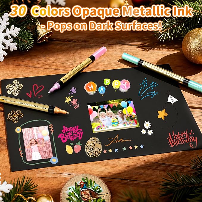 IVSUN 60 Acrylic Paint Markers, 30 Metallic & 30 Regular Colors Dual Tip Metallic Marker Pens for Black Paper, Photo Album, Rock Painting, Glass, Wood, Card Making, Scrapbook Supplies, DIY Crafts