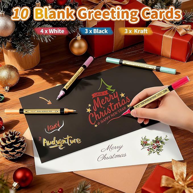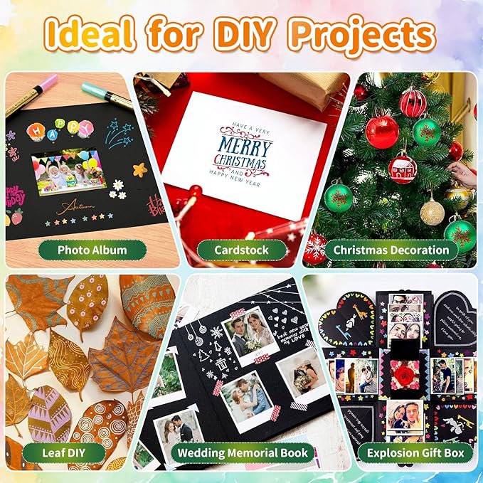 - Multi-Surface: Metallic pens are suitable for creating art on a variety of surfaces, including black paper, stones, ceramics, glass, wood, fabric, metal, plastic, photo albums, scrapbooking, bullet journals, cards or DIY craft projects.The included 10 high-quality thick cardstocks are ideal for our paint markers. No bleed-through, perfect for drawing, writing, and creating one-of-a-kind DIY thank you cards for any occasion.