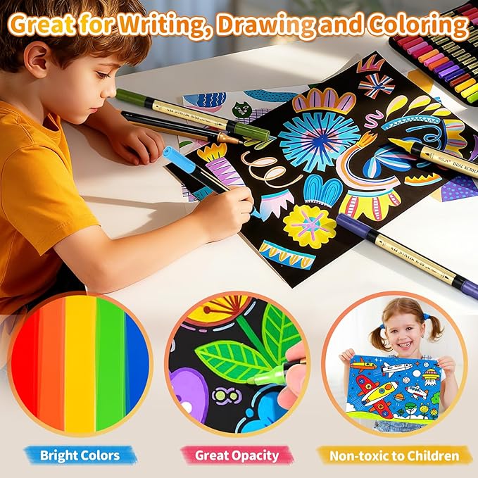 - Ready to Use, No Prep Needed:Unlike traditional acrylic pens, this one doesn't need to be shaken or pressed down on the nib to be used! Just uncap and start creating! Our glitter metallic marker pens have opaque ink formula, non-toxic, odorless and environmentally friendly. Extremely smooth, water-based ink dries quickly and is chemically stable and resistant to fading.
