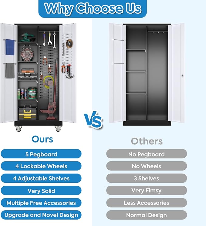- [ADJUSTABLE SHELVES] The tool cabinet has 4 adjustable shelves. The shelves can be adjusted up and down to the desired position for your household items, tools, and other items. Compared with common metal cabinets, our garage cabinets are more cost-effective!
