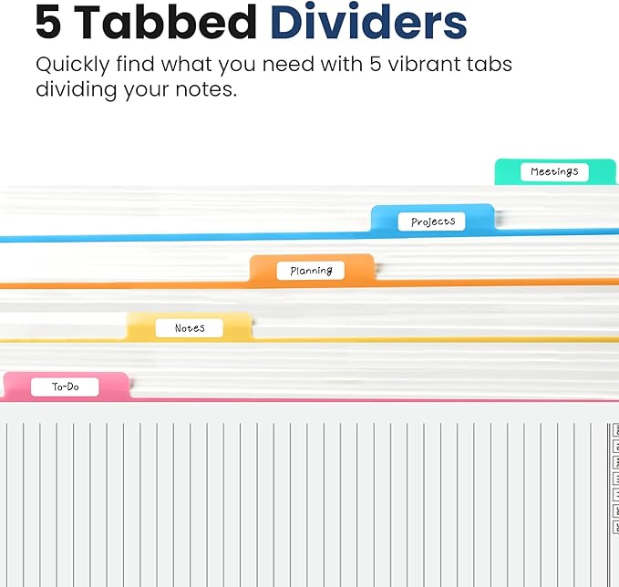 - 5 Subject Notebook with Dividers & Tabs: Stay organized with this 5 subject notebook, featuring 5 removable plastic dividers with tabs and 10 self-adhesive labels. These writable tabs make it easy to customize and categorize your notes for different subjects or projects—perfect for both school supplies and work planning.