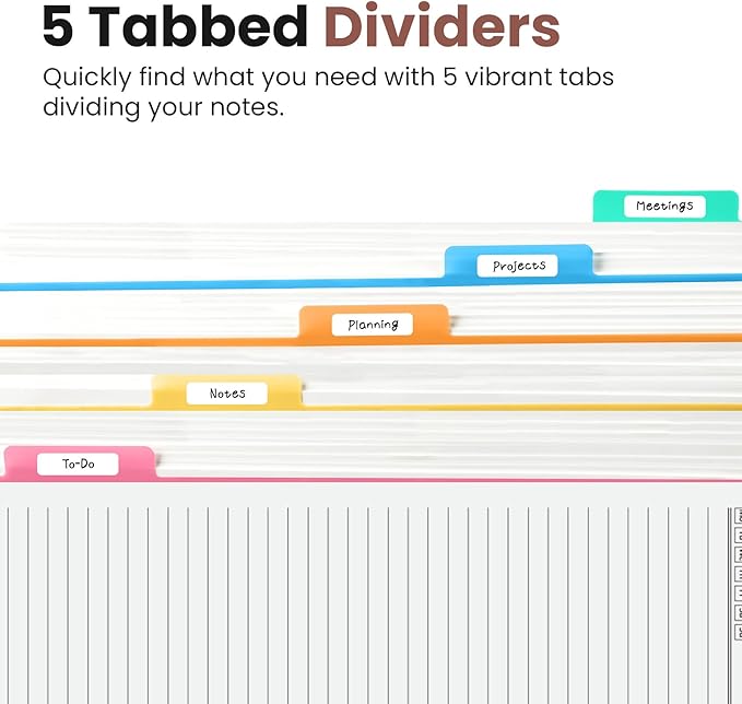 - 5 Subject Notebook with Dividers & Tabs: Stay organized with this 5 subject notebook, featuring 5 removable plastic dividers with tabs and 10 self-adhesive labels. These writable tabs make it easy to customize and categorize your notes for different subjects or projects—perfect for both school supplies and work planning.