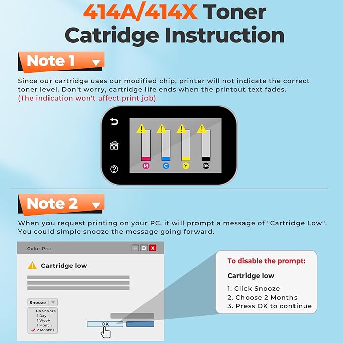 - Our 414A Toner cartridges have large capacity provide long-lasting print durability and reduced frequency of replacement; Specially designed toner formula ensures clear, natural, vibrant printing and prevents toner leaks.