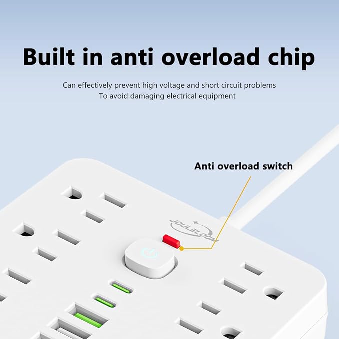 - 【Multiple Security Protection】JouleLoom 17in1 power strip integrates an 8-point safety system, including surge protection, fire resistance, overload protection, temperature control, and more. It has overload protection and will light up red during normal operation. When overloaded, the power switch will automatically trip to protect the equipment. Press the switch to restore. It ensures complete safety for you and your devices, whether at home or in the office, for long-lasting and stable operation