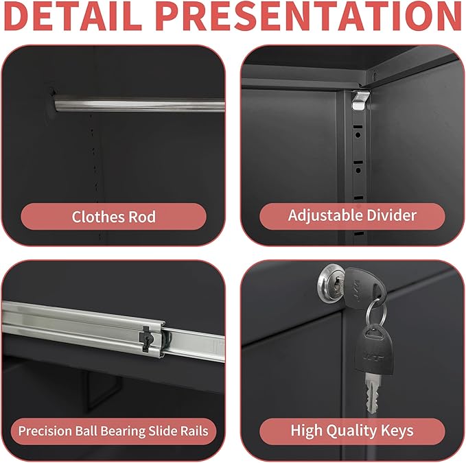 - 【Unique and Functional Design】The left side with slider drawer can be used to store your file of Legal/Letter size. while the right side of this metal file cabinet is equipped with 1 locking door and hanger,great for hanging your clothing or storing other belongs