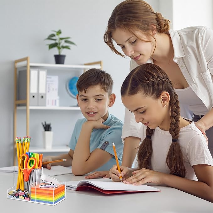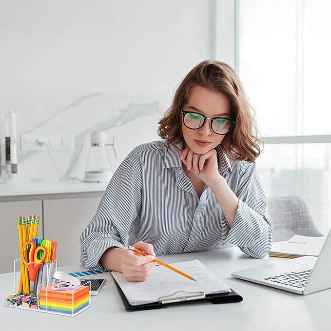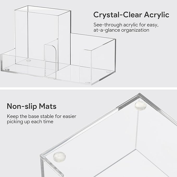 - Pen Holder for Desk: This compact acrylic desk organizer with 3 compartments (6.46”L x 3.35”W x 3.63”H) is perfect for storing small items such as pens, pencils, scissors, 3x3 inch sticky notes (maximum size), paper clips, and more to keep your desk tidy and organized without eating up your desk space